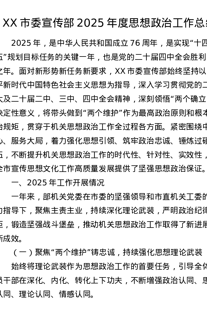 XX市委宣传部2025年度思想政治工作总结