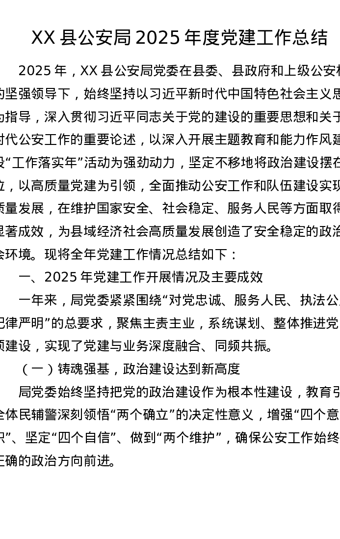 XX县公安局2025年度党建工作总结