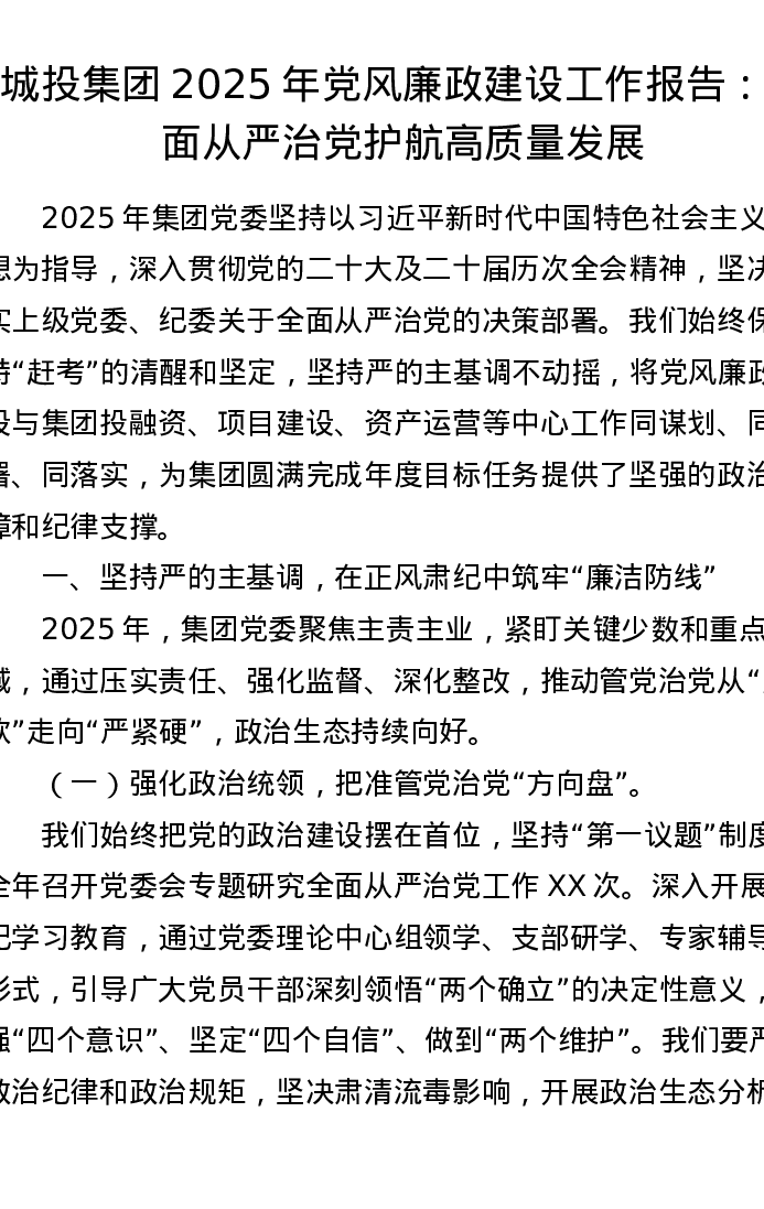 城投集团2025年党风廉政建设工作报告:全面从严治党 护航高质量发展