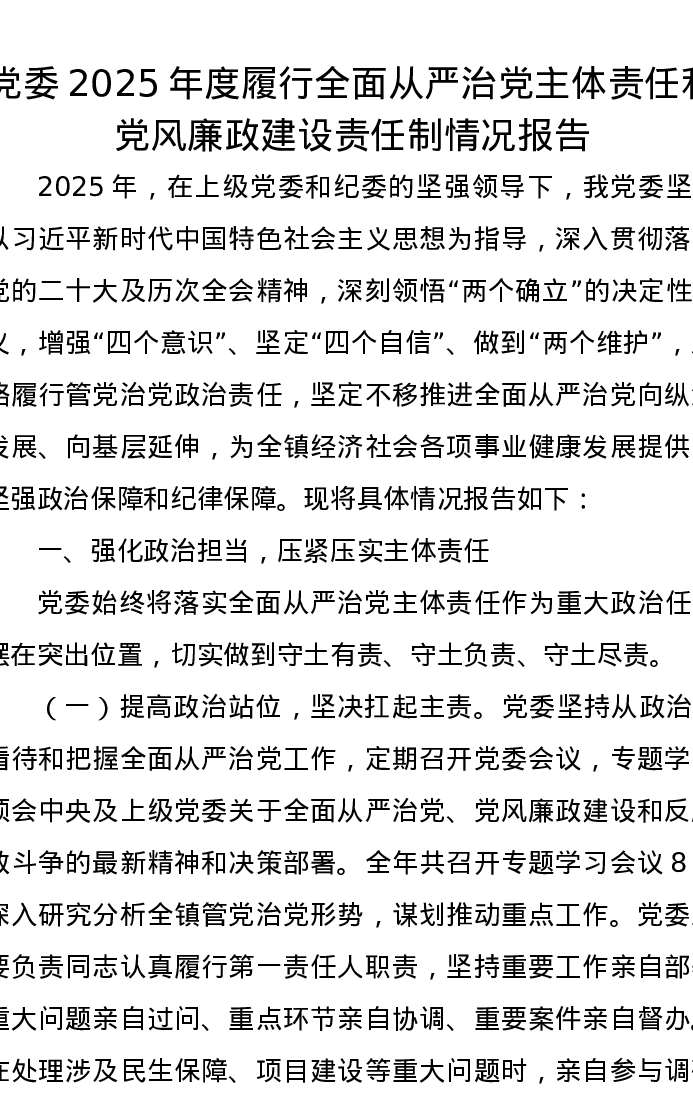 党委2025年度履行全面从严治党主体责任和党风廉政建设责任制情况报告