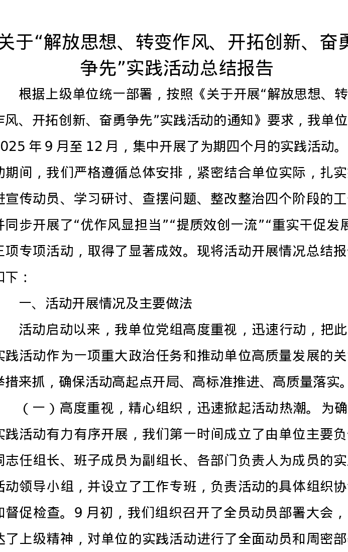 关于解放思想、转变作风、开拓创新、奋勇争先实践活动总结报告