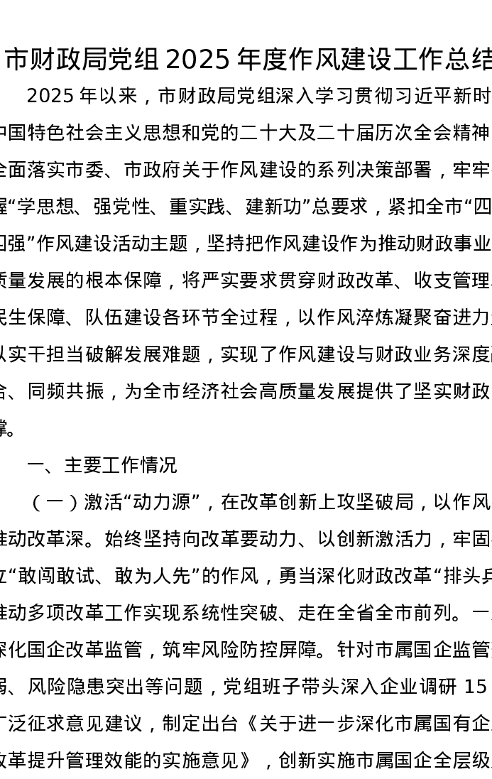 市财政局党组2025年度作风建设工作总结