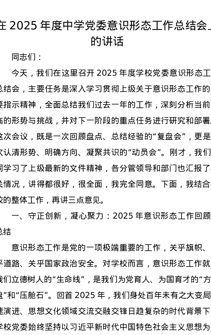 在2025年度中学党委意识形态工作总结会上的讲话