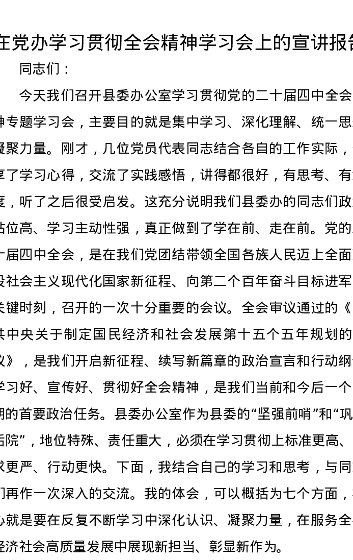 在党办学习贯彻全会精神学习会上的宣讲报告