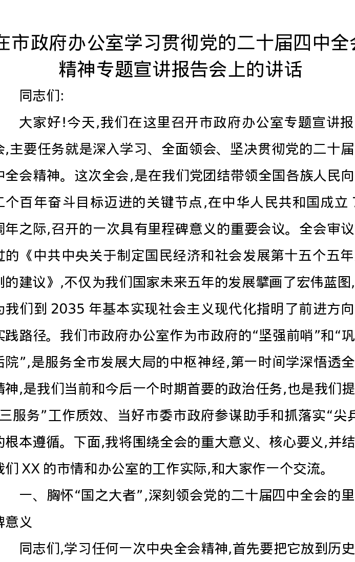 在市政府办公室学习贯彻党的二十届四中全会精神专题宣讲报告会上的讲话