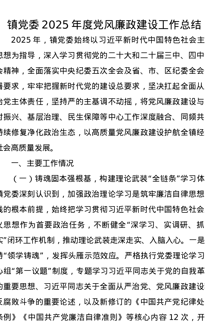镇党委2025年度党风廉政建设工作总结