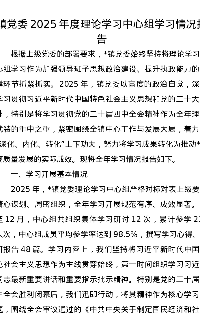 镇党委2025年度理论学习中心组学习情况报告