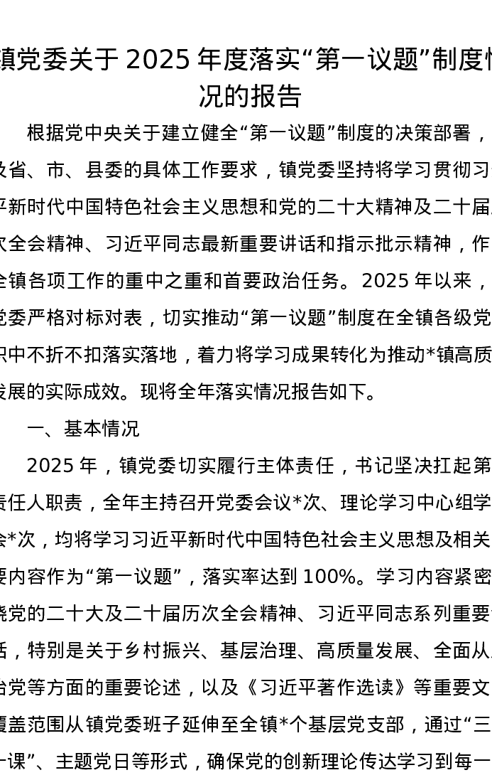 镇党委关于2025年度落实第一议题制度情况的报告