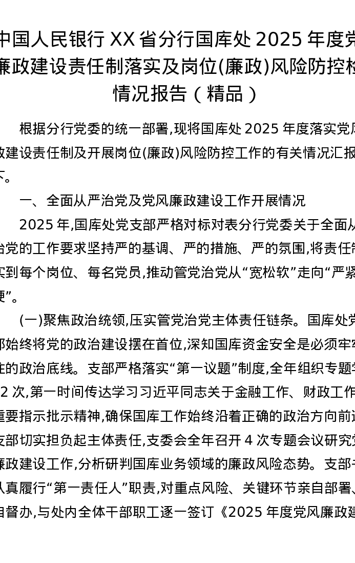 中国人民银行XX省分行国库处2025年度党风廉政建设责任制落实及岗位(廉政)风险防控检查情况报告