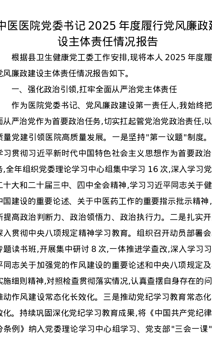 中医医院党委书记2025年度履行党风廉政建设主体责任情况报告