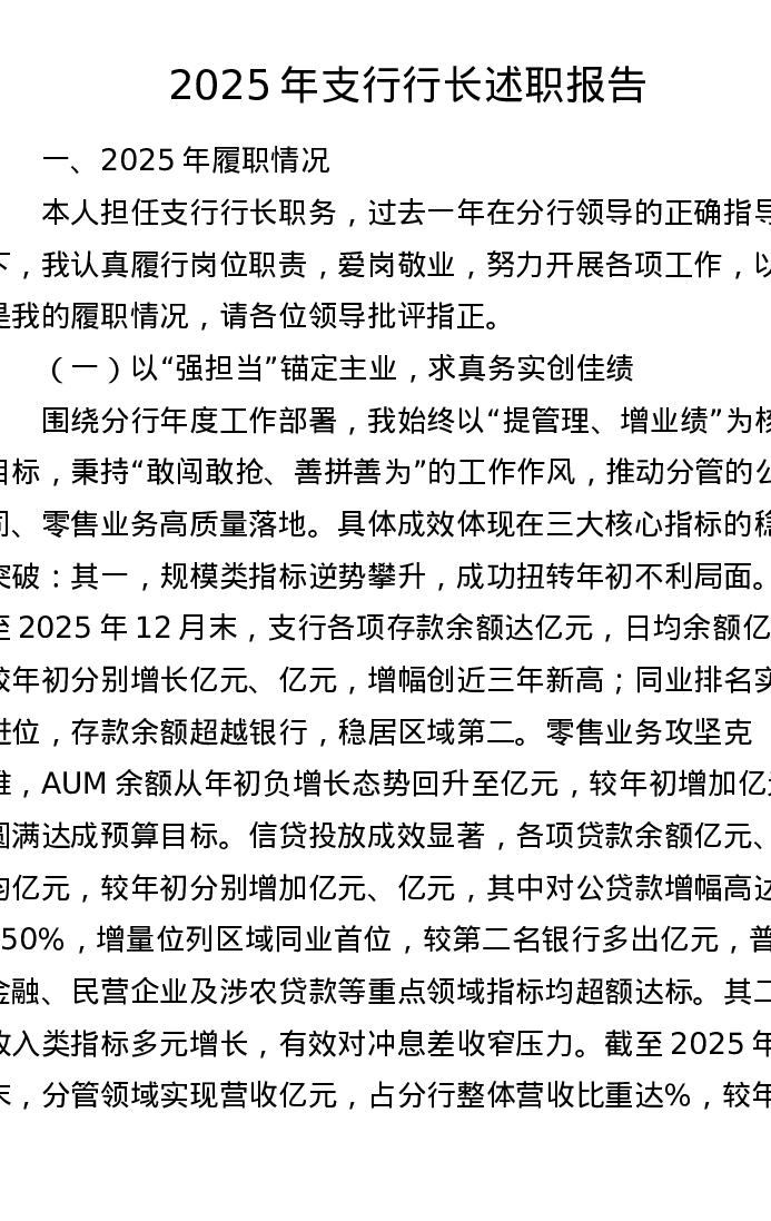 2025年支行行长述职报告