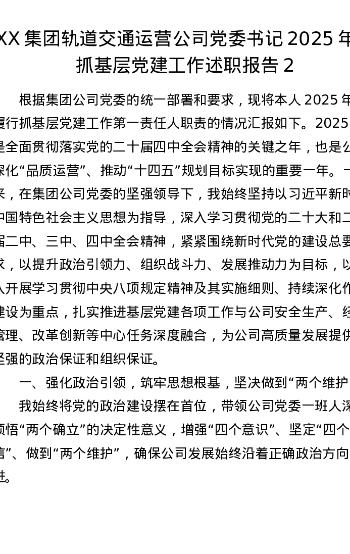 XX集团轨道交通运营公司党委书记2025年度抓基层党建工作述职报告2
