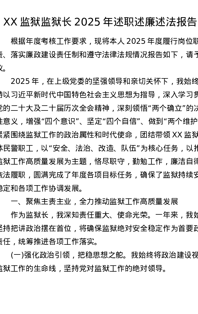 XX监狱监狱长2025年述职述廉述法报告3