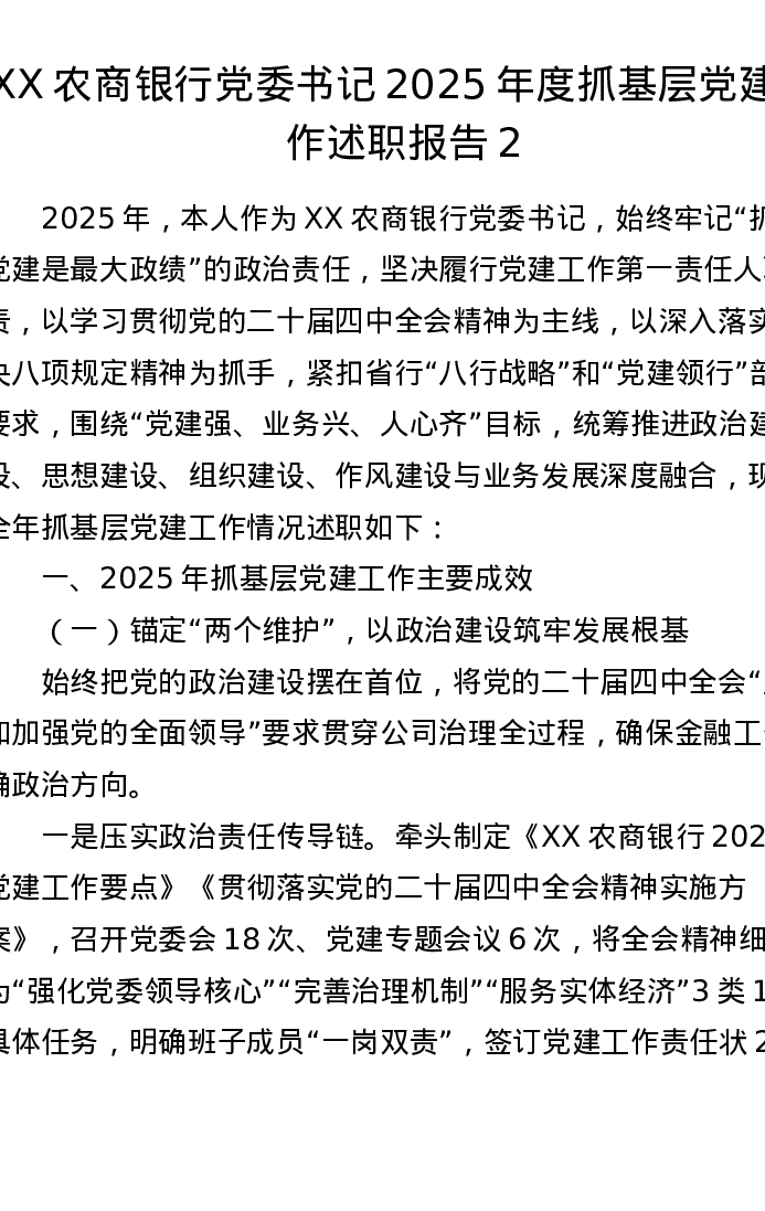 XX农商银行党委书记2025年度抓基层党建工作述职报告2