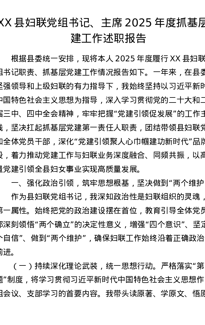 XX县妇联党组书记、主席2025年度抓基层党建工作述职报告