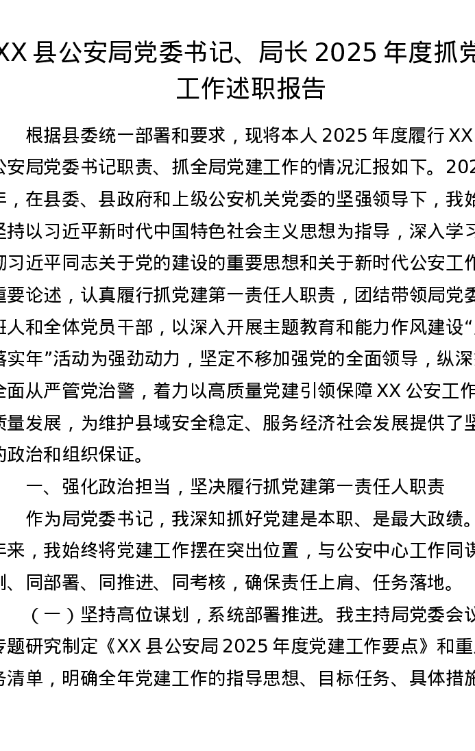 XX县公安局党委书记、局长2025年度抓党建工作述职报告
