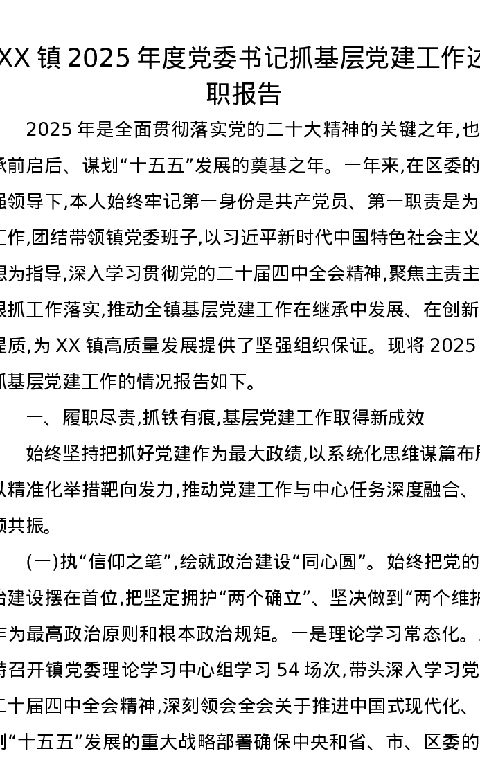 XX镇2025年度党委书记抓基层党建工作述职报告