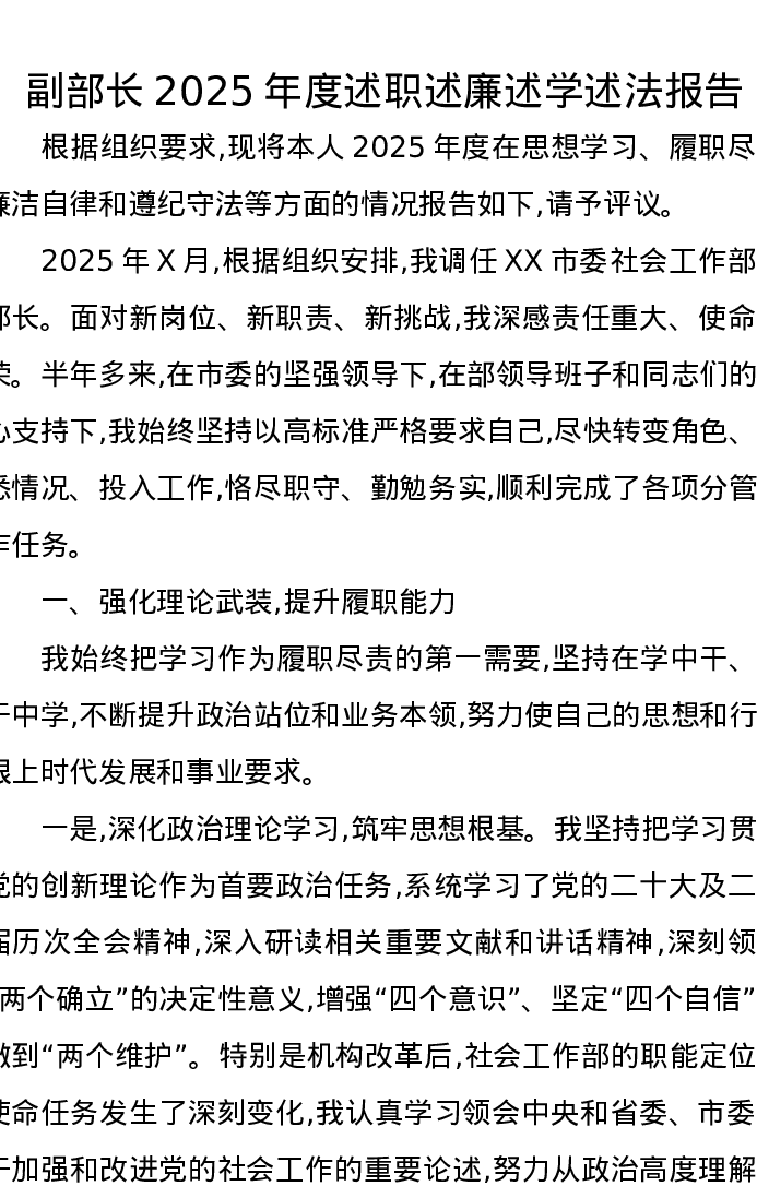 副部长2025年度述职述廉述学述法报告