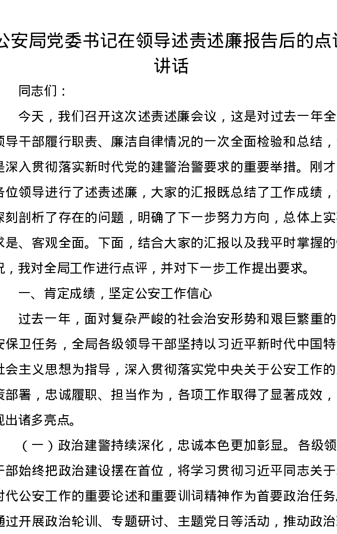 公安局党委书记在领导述责述廉报告后的点评讲话