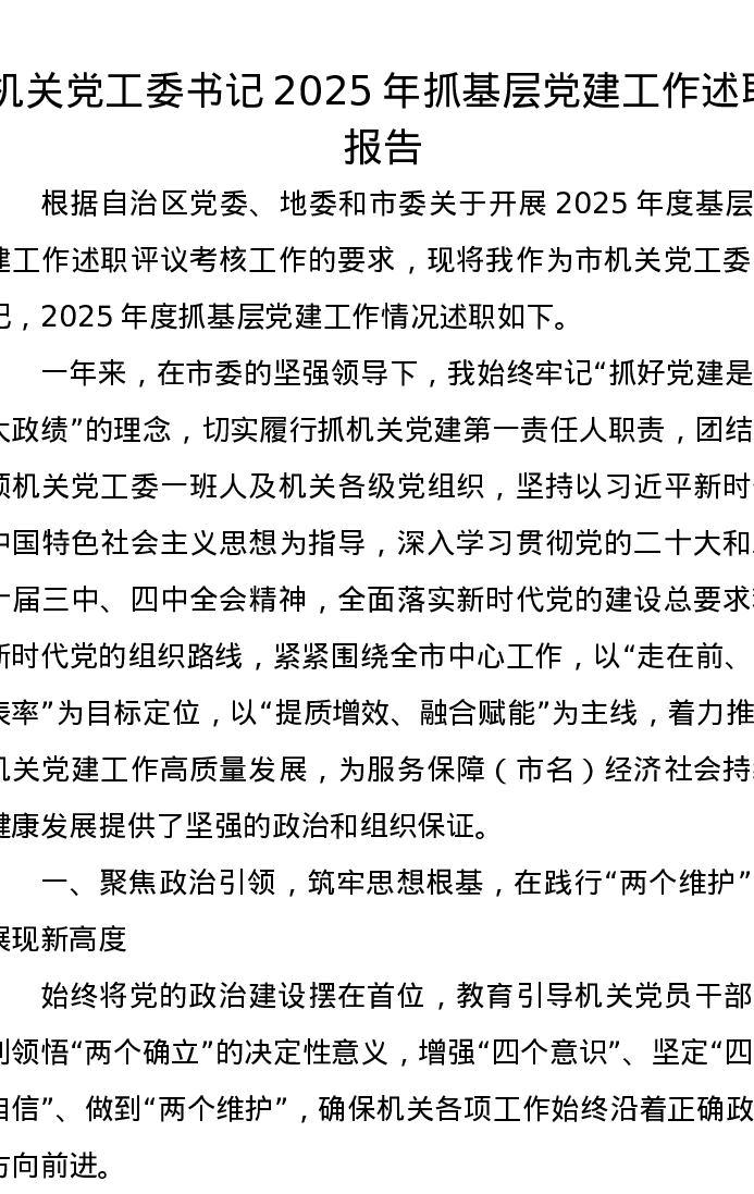 机关党工委书记2025年抓基层党建工作述职报告