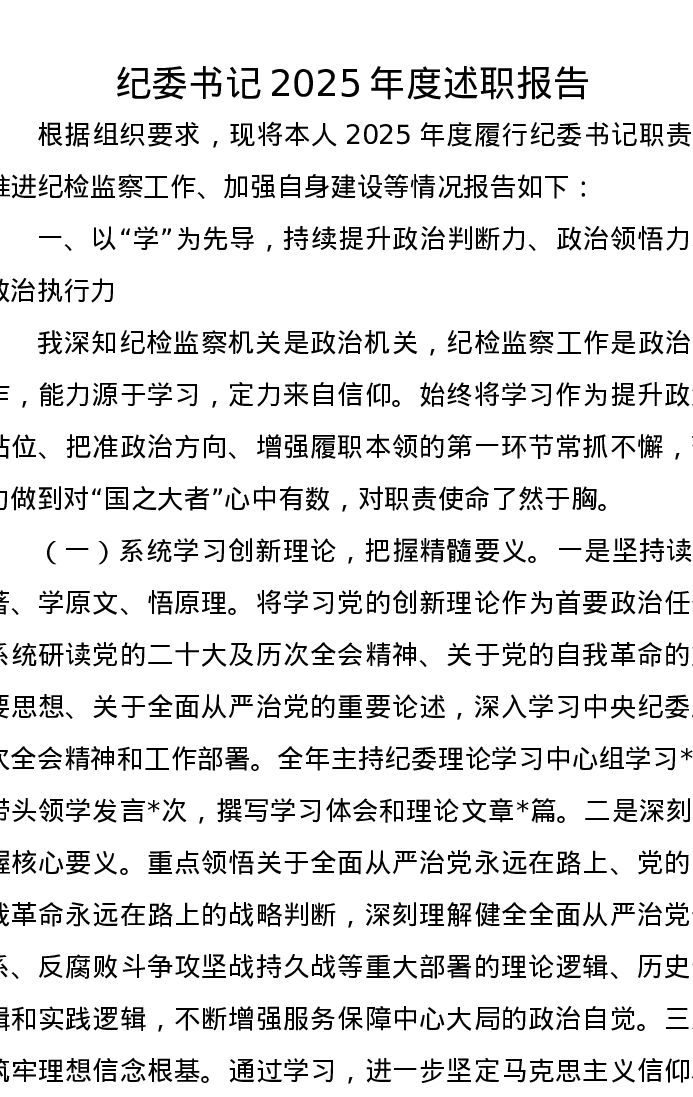 纪委书记2025年度述职报告