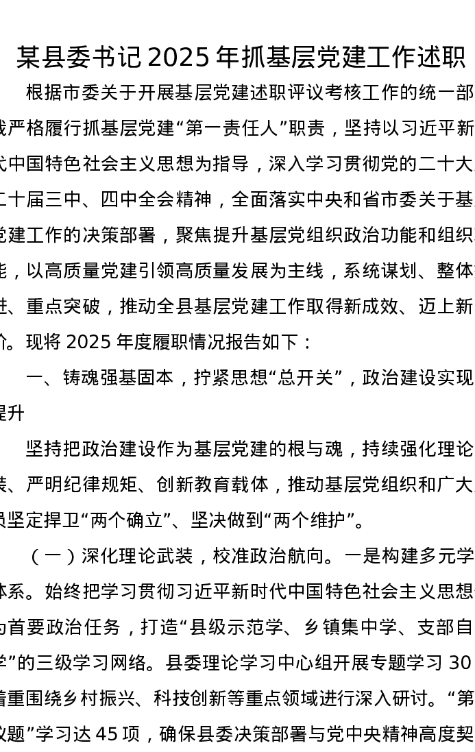 某县委书记2025年抓基层党建工作述职