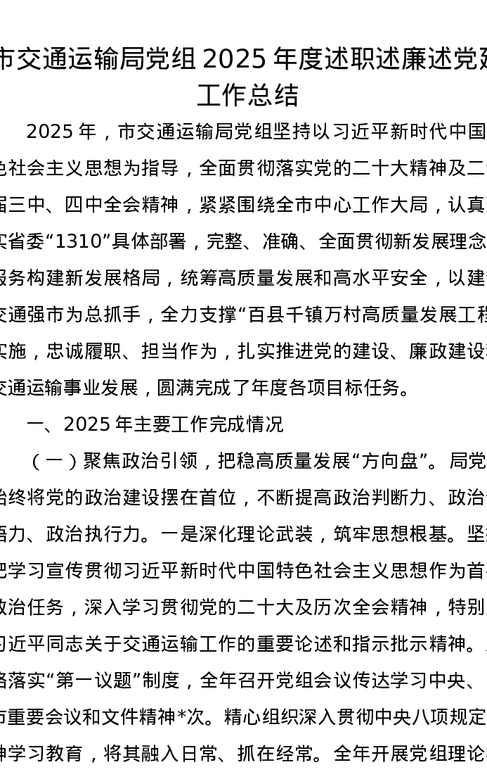 市交通运输局党组2025年度述职述廉述党建工作总结