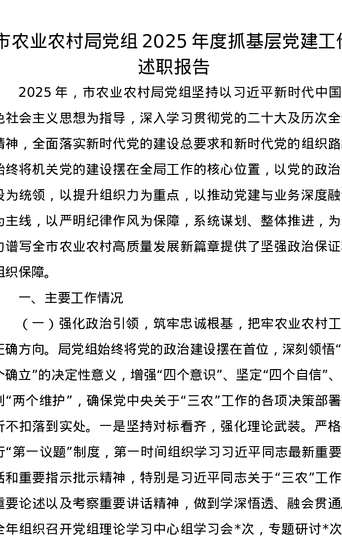 市农业农村局党组2025年度抓基层党建工作述职报告