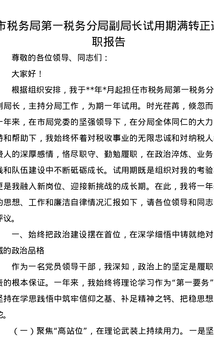 市税务局第一税务分局副局长试用期满转正述职报告