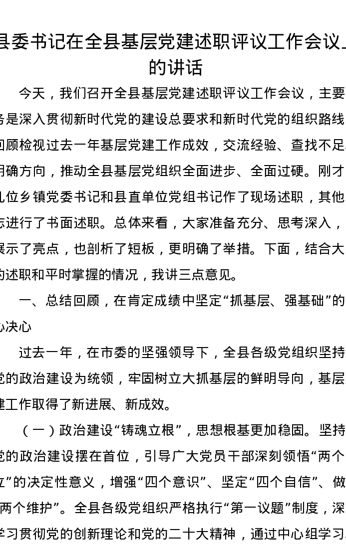 县委书记在全县基层党建述职评议工作会议上的讲话