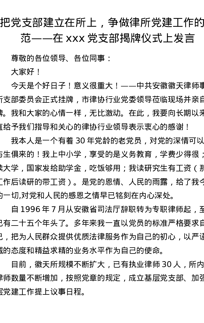 把党支部建立在所上,争做律所党建工作的模范——在xxx党支部揭牌仪式上发言