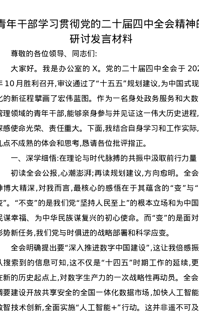 青年干部学习贯彻党的二十届四中全会精神的研讨发言材料