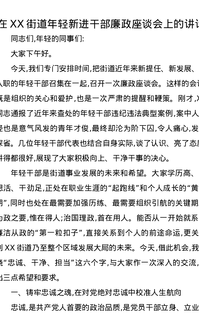 在XX街道年轻新进干部廉政座谈会上的讲话