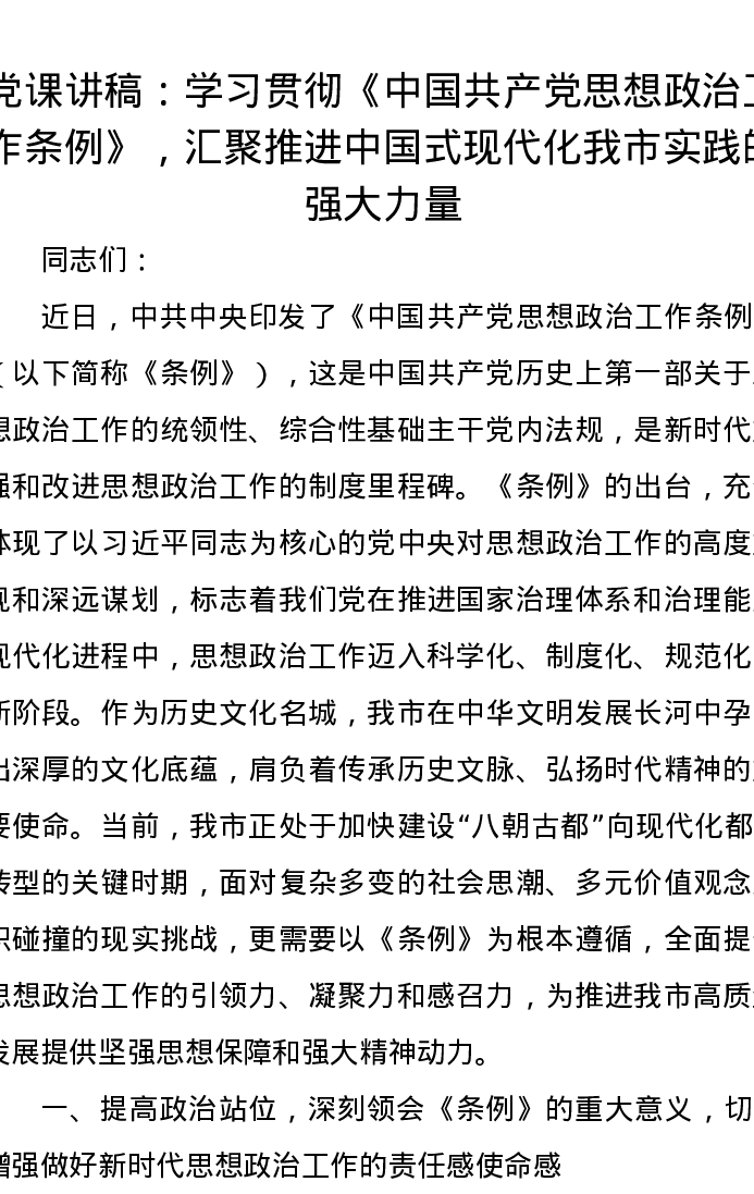 党课讲稿:学习贯彻《中国共产党思想政治工作条例》,汇聚推进中国式现代化我市实践的强大力量