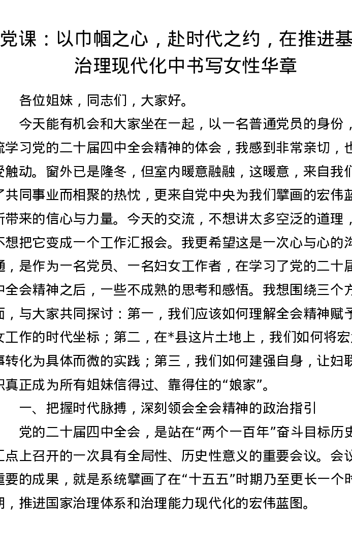 党课讲稿:以巾帼之心,赴时代之约,在推进基层治理现代化中书写女性华章