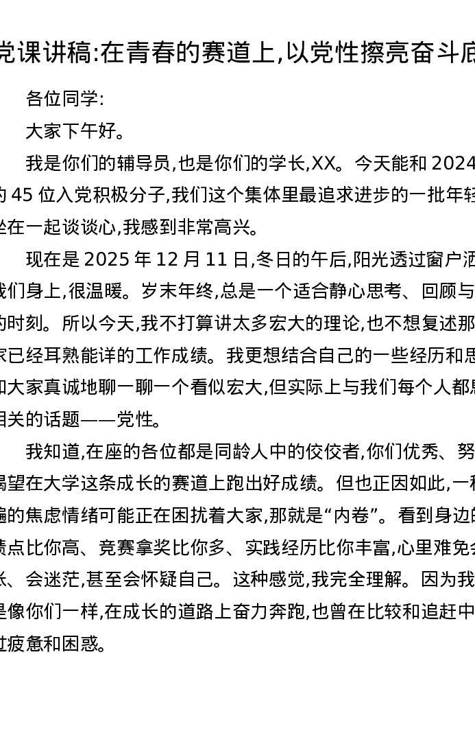 党课讲稿:在青春的赛道上,以党性擦亮奋斗底色