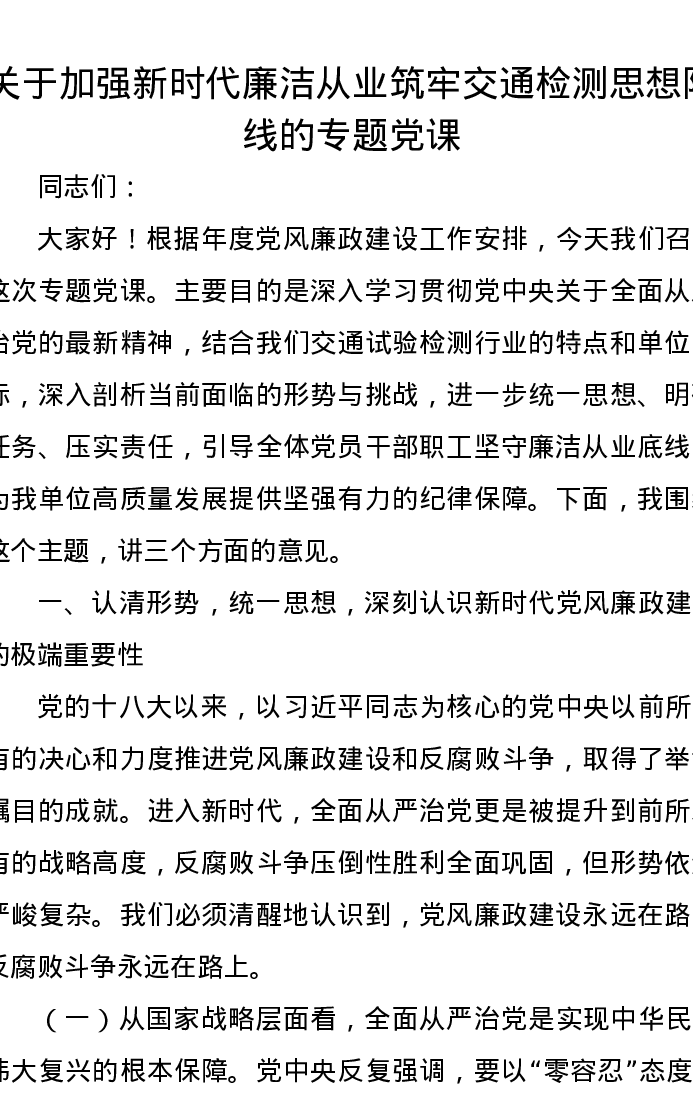 关于加强新时代廉洁从业筑牢交通检测思想防线的专题党课讲稿