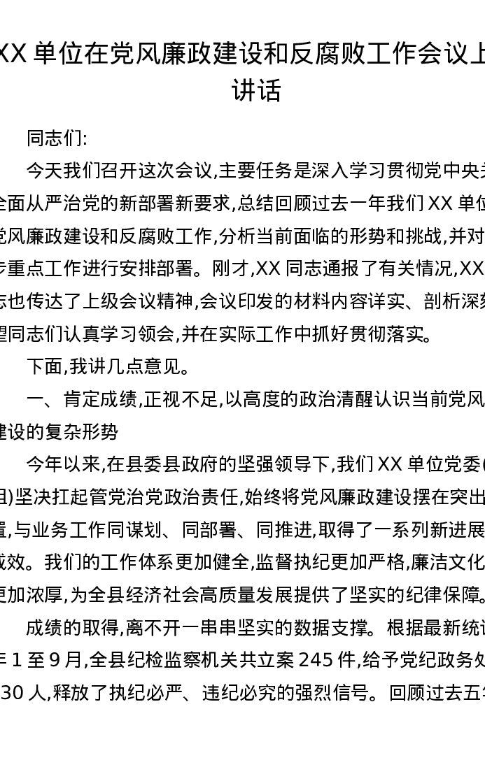 XX单位在党风廉政建设和反腐败工作会议上的讲话
