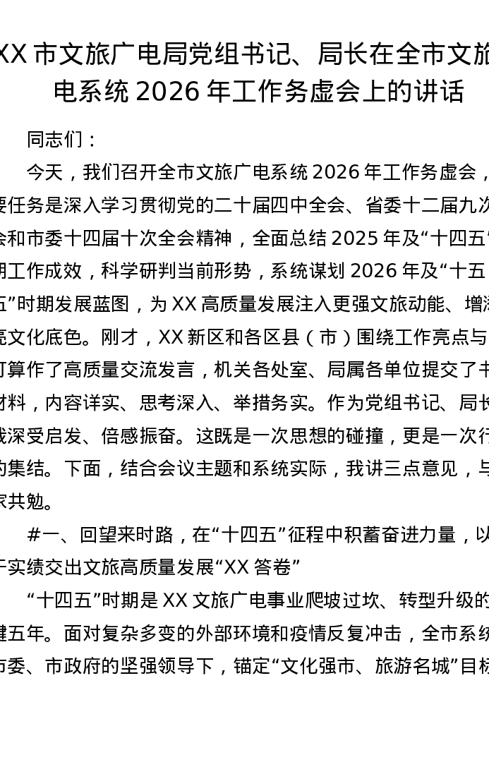XX市文旅广电局党组书记、局长在全市文旅广电系统2026年工作务虚会上的讲话(5791字)