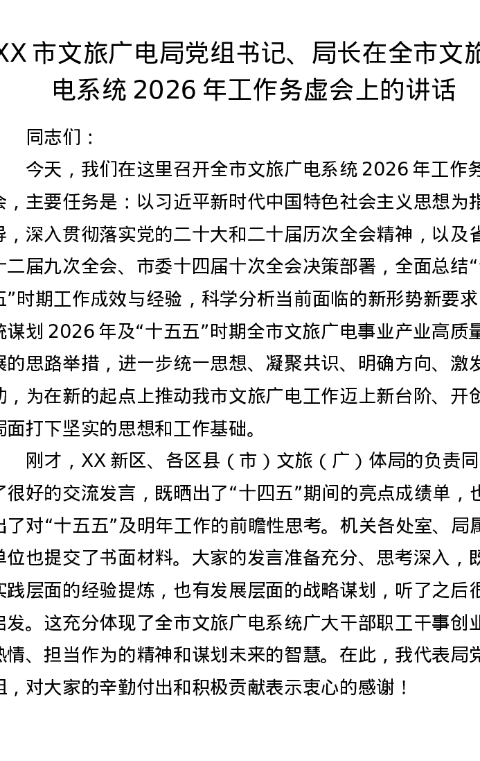 XX市文旅广电局党组书记、局长在全市文旅广电系统2026年工作务虚会上的讲话(7127字)