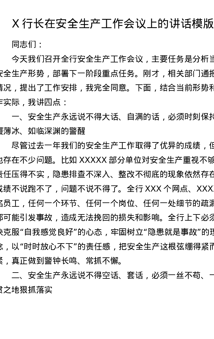 X行长在安全生产工作会议上的讲话模版