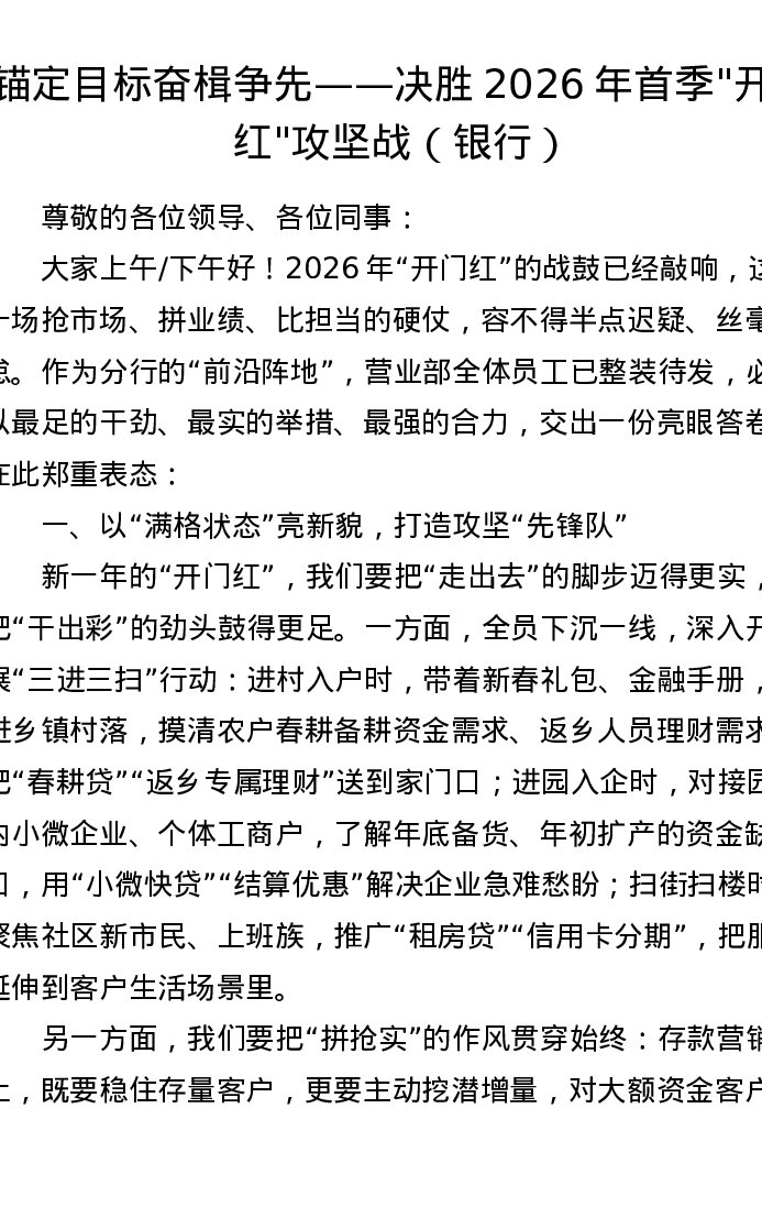 讲话:锚定目标 奋楫争先——决胜2026年首季开门红攻坚战(银行)
