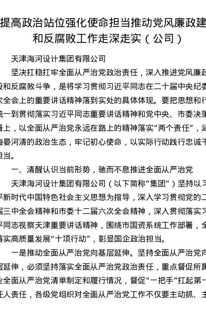 讲话:提高政治站位 强化使命担当 推动党风廉政建设和反腐败工作走深走实(公司)