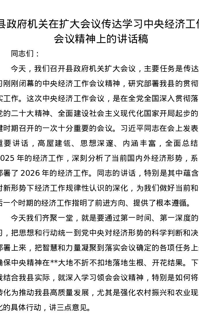 县政府机关在扩大会议传达学习中央经济工作会议精神上的讲话稿