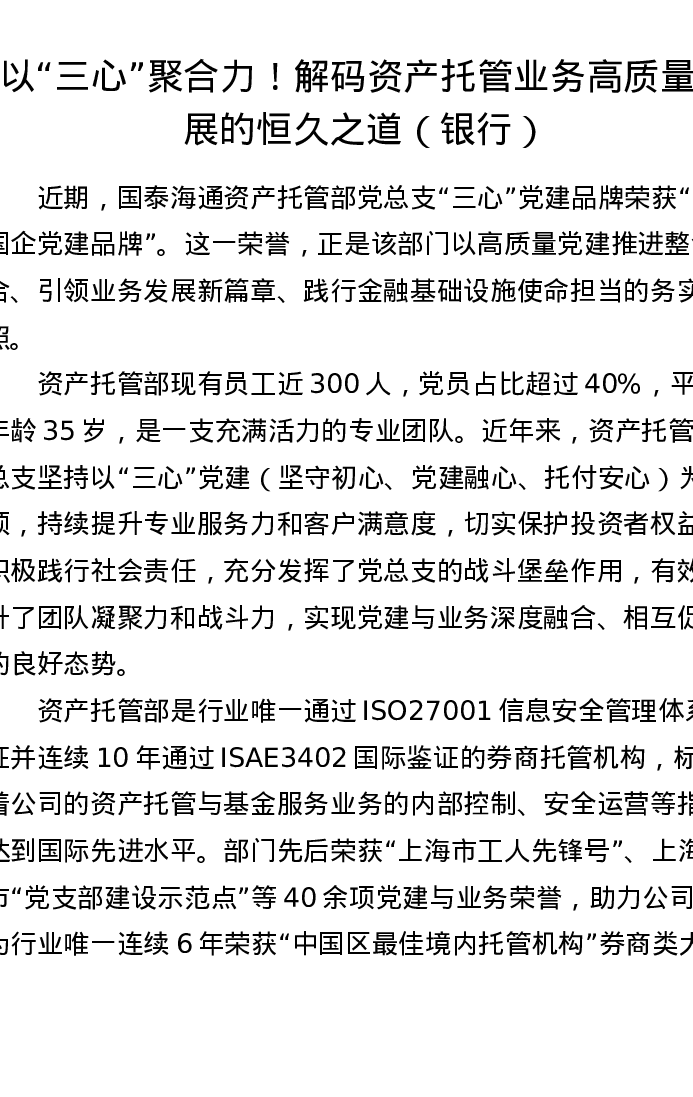 以三心聚合力!解码资产托管业务高质量发展的恒久之道(银行)