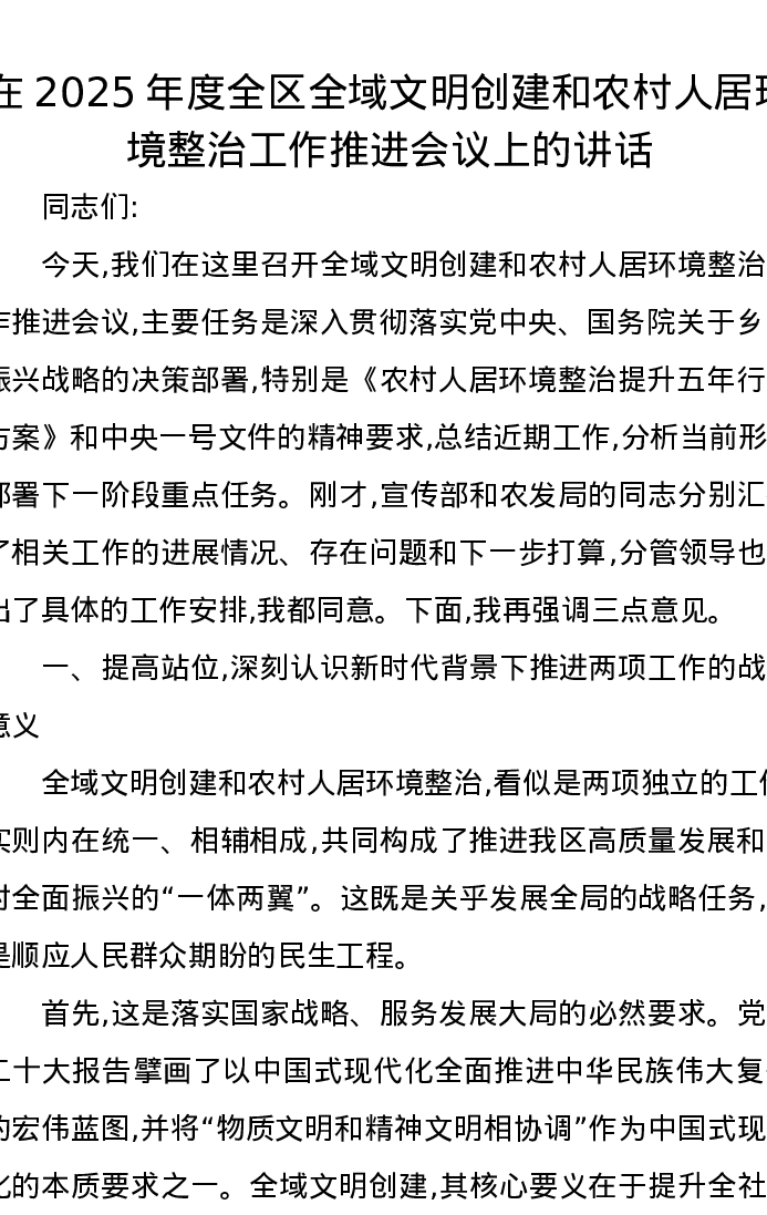 在2025年度全区全域文明创建和农村人居环境整治工作推进会议上的讲话