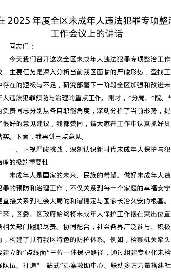 在2025年度全区未成年人违法犯罪专项整治工作会议上的讲话