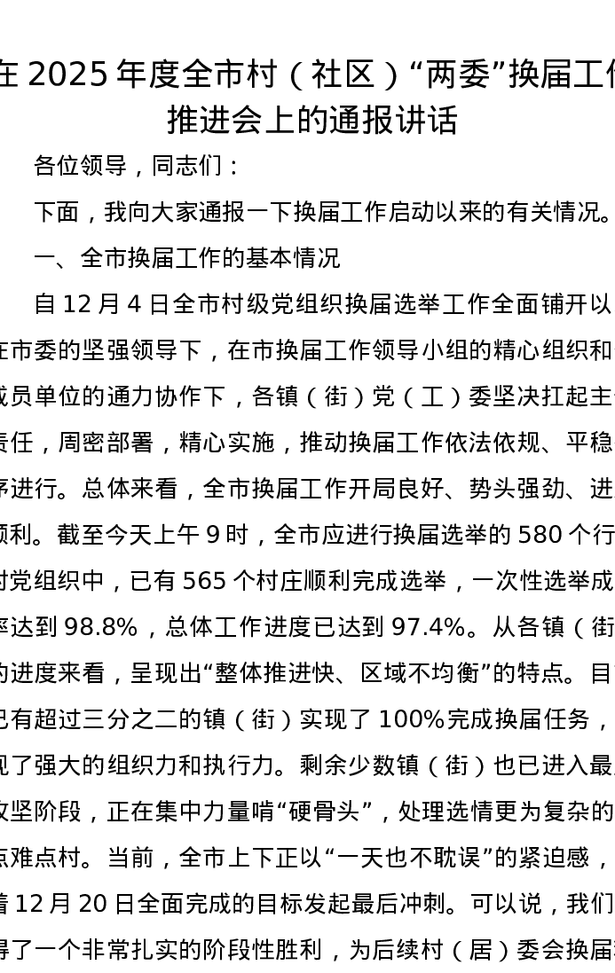 在2025年度全市村(社区)两委换届工作推进会上的通报讲话