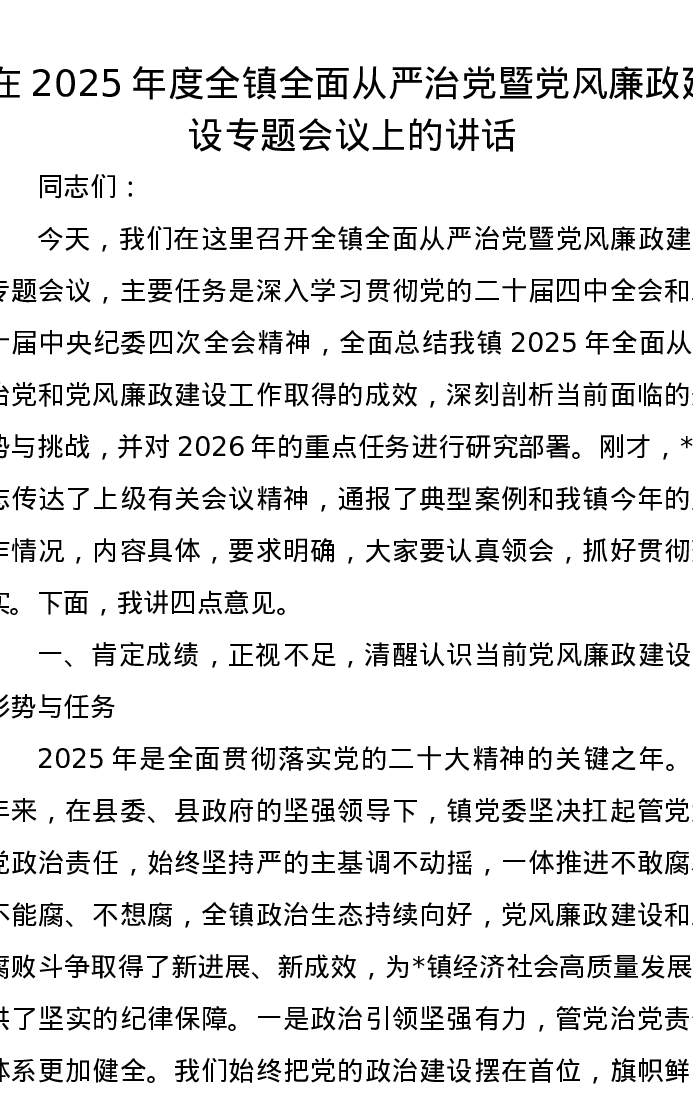 在2025年度全镇全面从严治党暨党风廉政建设专题会议上的讲话