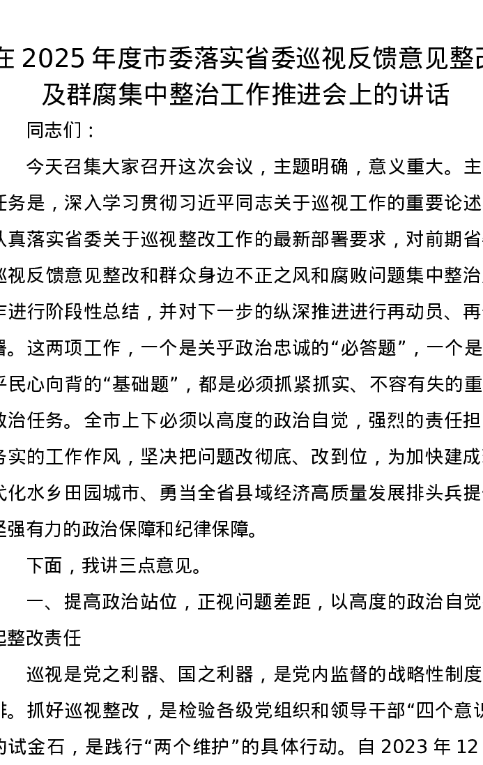 在2025年度市委落实省委巡视反馈意见整改及群腐集中整治工作推进会上的讲话